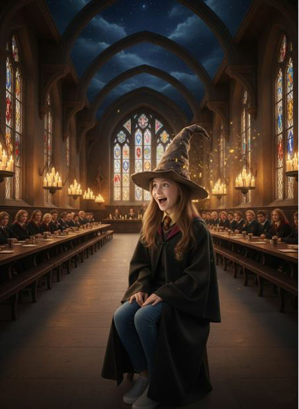 El interior del castillo era deslumbrante: muros altísimos, antorchas encendidas, relojes antiguos y escaleras que se movían solas. Un profesor me recibió con amabilidad y me pidió seguirlo. Caminamos hasta una gran sala con mesas largas y velas flotantes que iluminaban el ambiente con luz dorada. Allí me esperaban estudiantes de todas las edades, cada uno con túnicas de distintos colores.